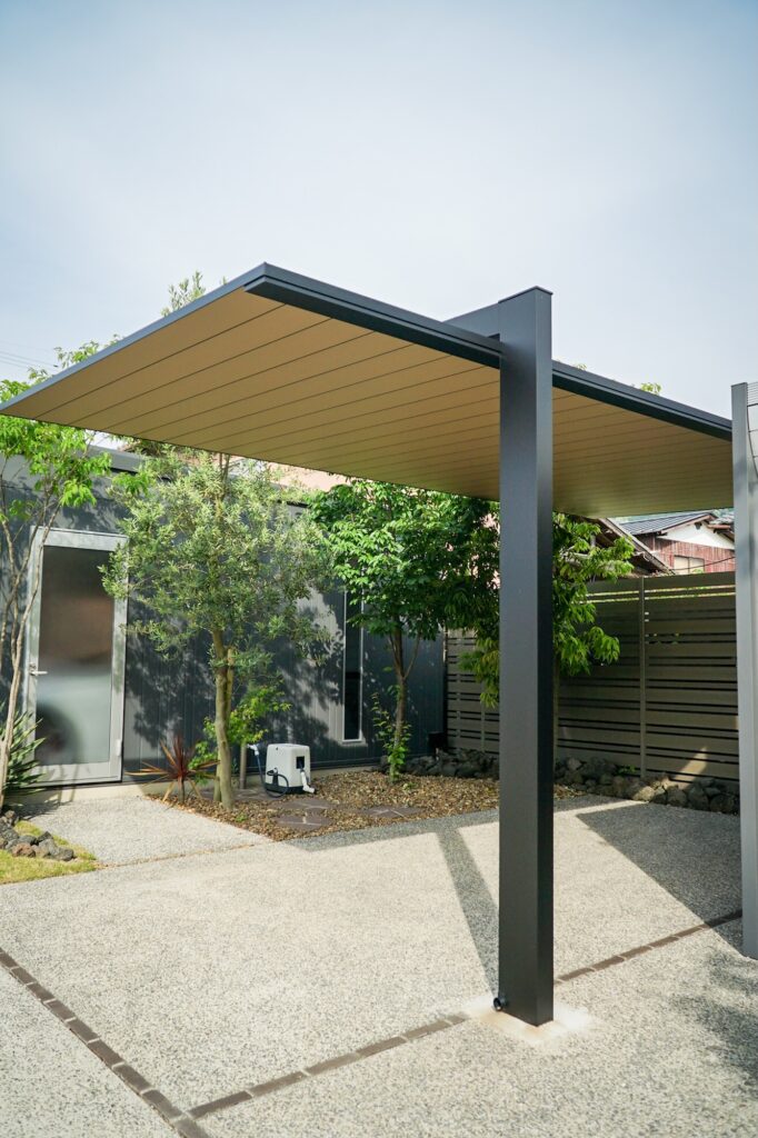 2024年12月に施工をして、ショールームに加わった「プレーンルーフ(1台用)」。シンプルでありながら機能性を兼ね備えたカーポートです。