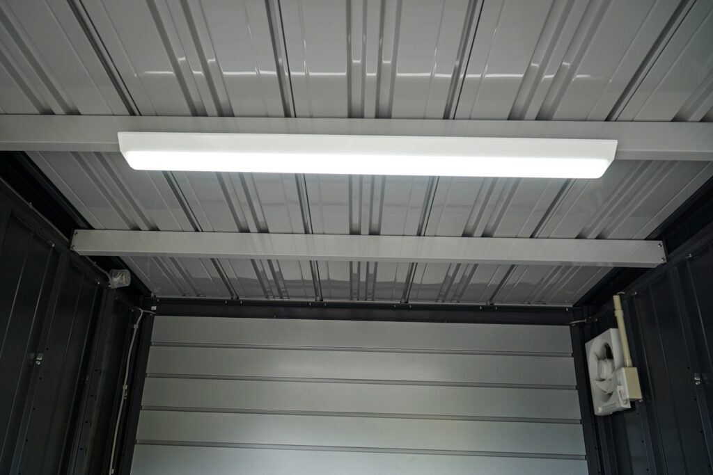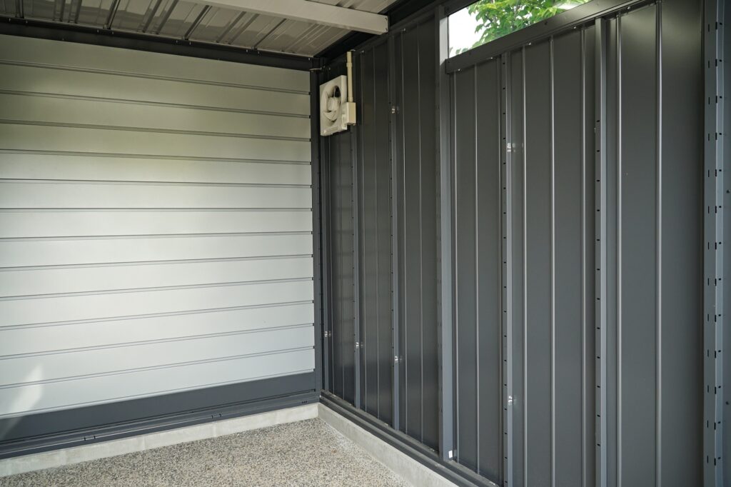 展示では、実際に使用する場合を考え、換気扇や窓などのオプションも取り付けております。デザイン性に加えて、バイクを保管する上での快適さと便利さを体感いただけますと嬉しいです。