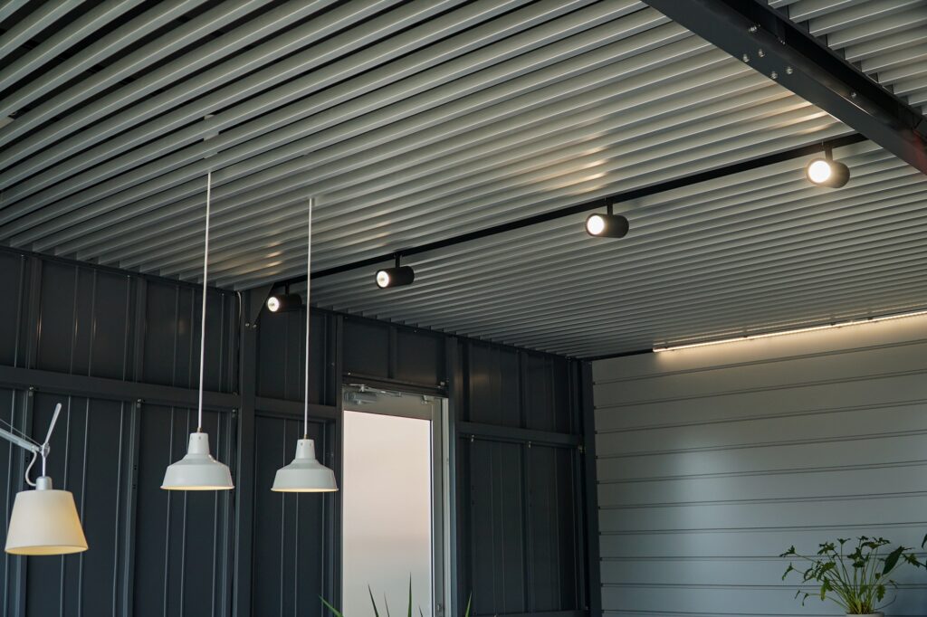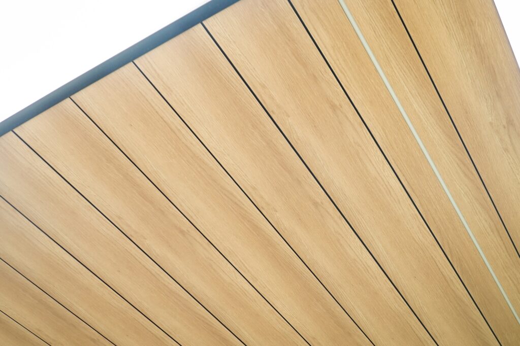 一番明るい「オーク」の屋根材を採用しており、木調の温かみを感じるデザインが魅力。ライトは、ダウンライトを搭載しております。実際にお車を停めていただき、少し離れた場所から屋根の傾斜をチェックすることもできるのもショールームならではの嬉しいポイントですね!