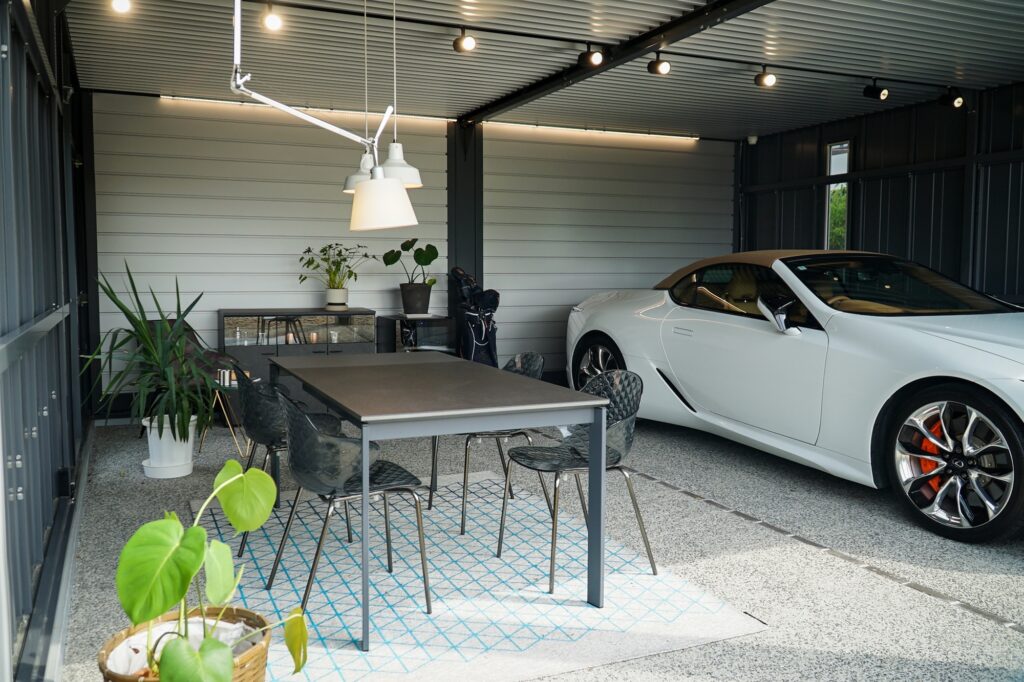 高級感のあるグレーカラーの壁や、ガレージ内のライト(様々なタイプのライトを設置してみました!)、タイヤ痕がつきにくいコンクリート洗い出しの床やガレージの奥に取り付けてある扉などもチェックしてみてください。
