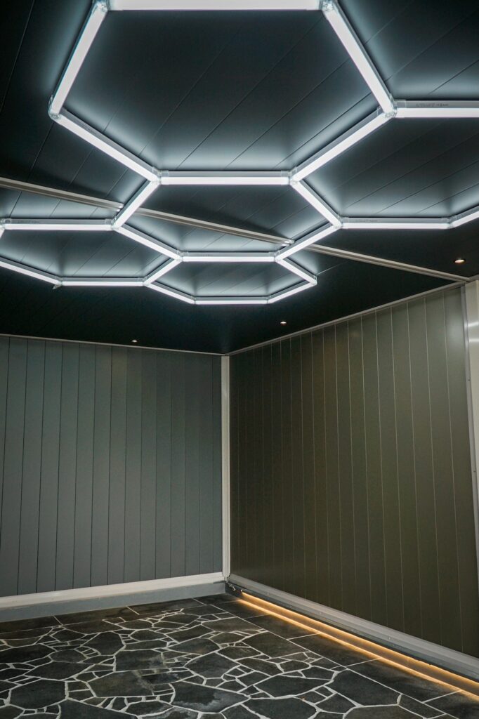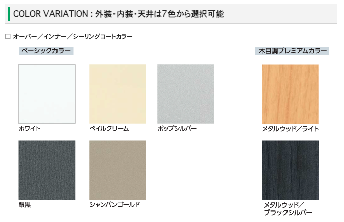 「ラヴィージュⅢ」の最大の特徴は、シャッターカラーや壁材や天井材の豊富なオプション。シャッターカラーは、「ラグジュアリーグレー」「リッチブラック」「ラグジュリアスウッド」の3種類(※2025年2月にリニューアル)。壁材(外装、内装)や天井材などが自由に選べる「ドレスドオプション」では、「銀黒」「ポップシルバー」「シャンパンゴールド」など7色のカラーから選ぶことができます。ショールームでは「ラグジュリアスウッド」のシャッターと「シャンパンゴールド」の内装、格子を使った外装を取り入れ、外壁には格子を設置しております。