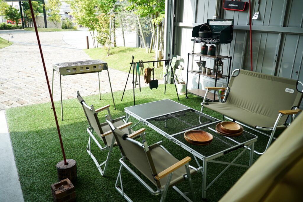 「ブローディア」では、BBQセットなどを設置して、ガレージで楽しむアウトドアライフの魅力を表現してみました。広々としたガレージ内のスペースは、趣味の空間作りにも適しています。