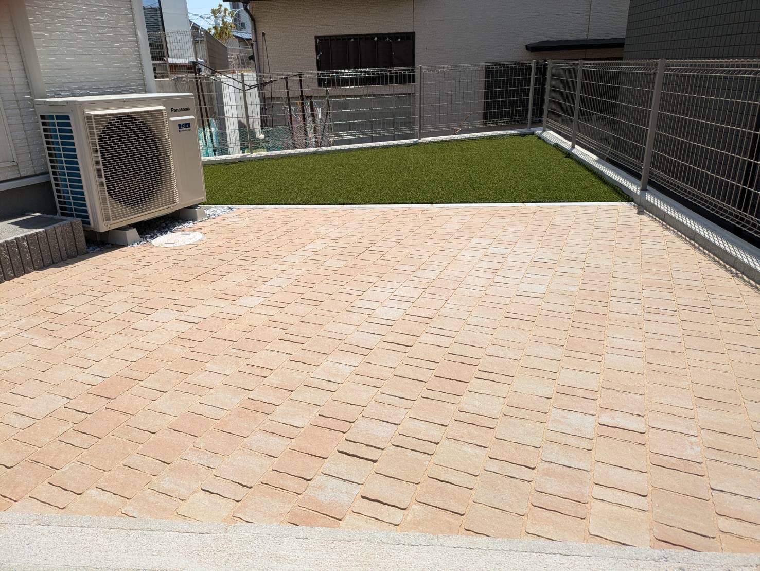お庭の床面には、人工芝とインターロッキングをご提案。