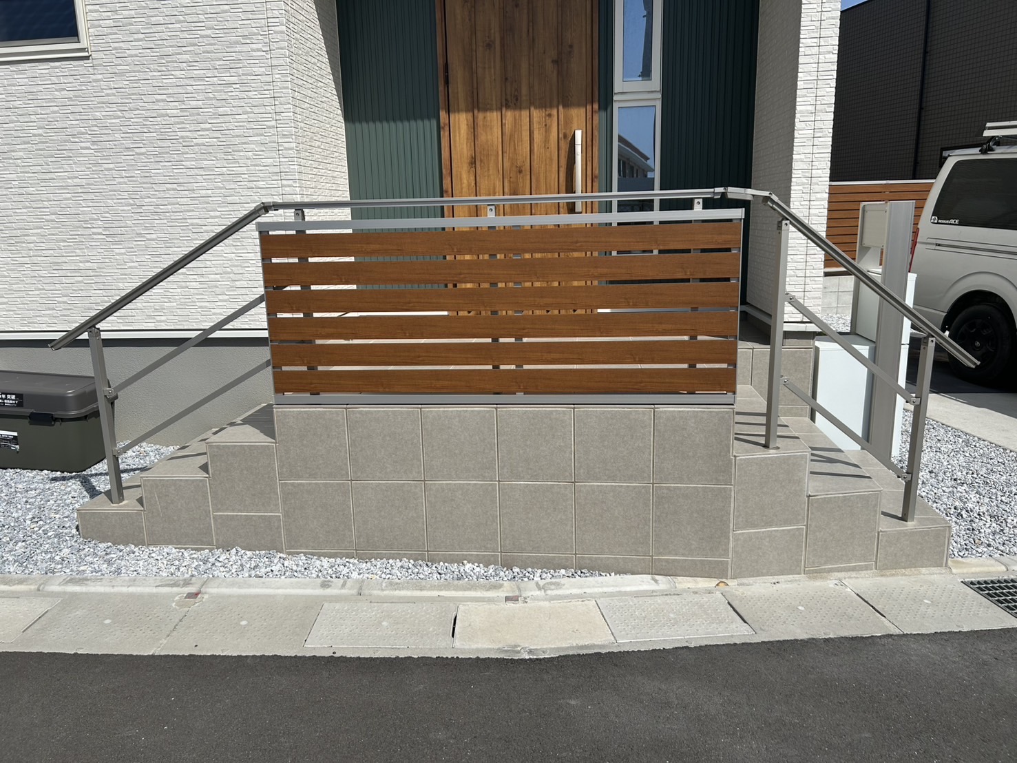 道路側と玄関前に設置した目隠しフェンスは、庭の雰囲気に合わせキャラメルチークのベージュ系をセレクト。木目調の素材感を生かしつつ、圧迫感のない高さに設定しました。